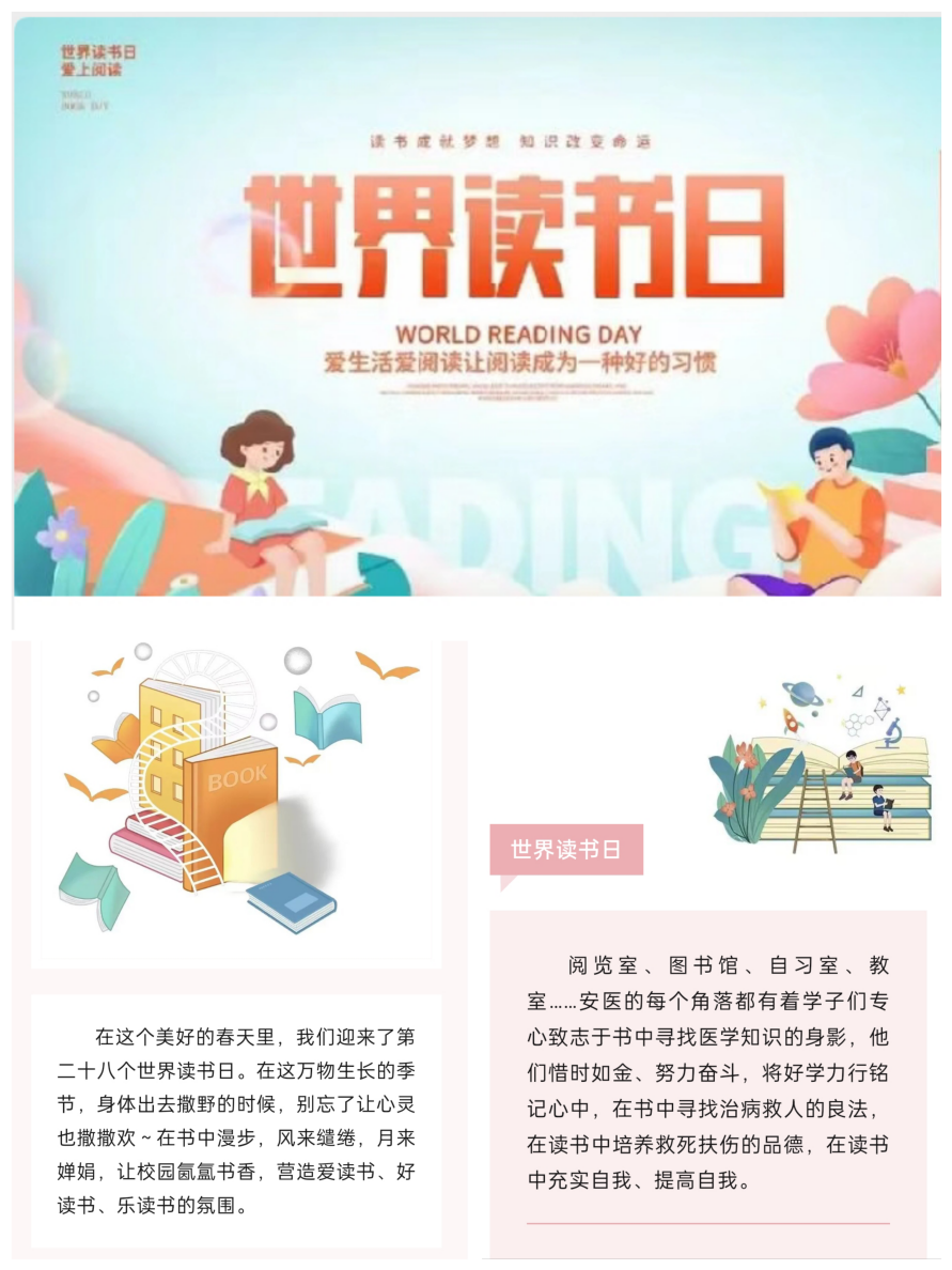 融合视听媒体技术,激发阅读热情。该院线上线下阅读宣传方式相结合,举办”读白衣红心 阅安医芳华”主题读书创作活动,融合新媒体技术,创新书籍分享途径,通过指导学生开展读书主题征文活动、制作读书朗诵音频和好书分享视频,设计读书分享海报等学生喜闻乐见的形式,充分激发学生阅读兴趣,引导学生快乐阅读,从阅读中汲取奋进力量、坚定理想信念。